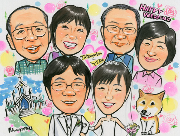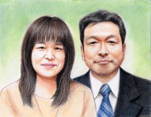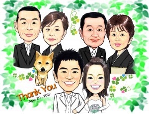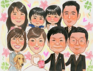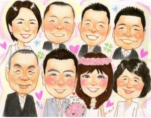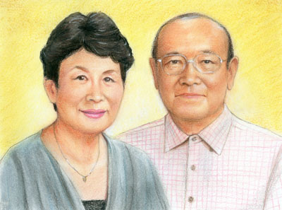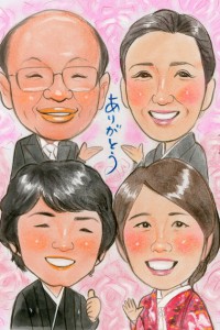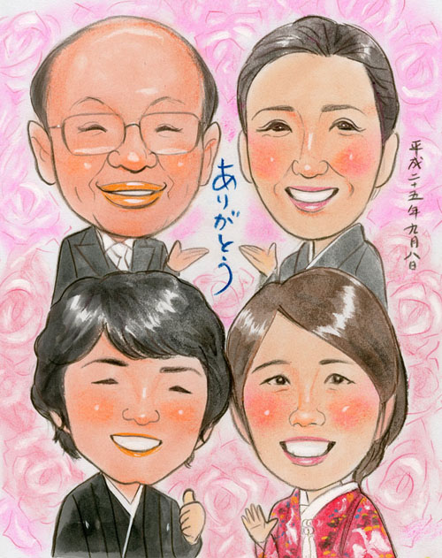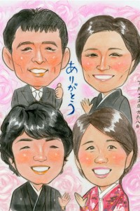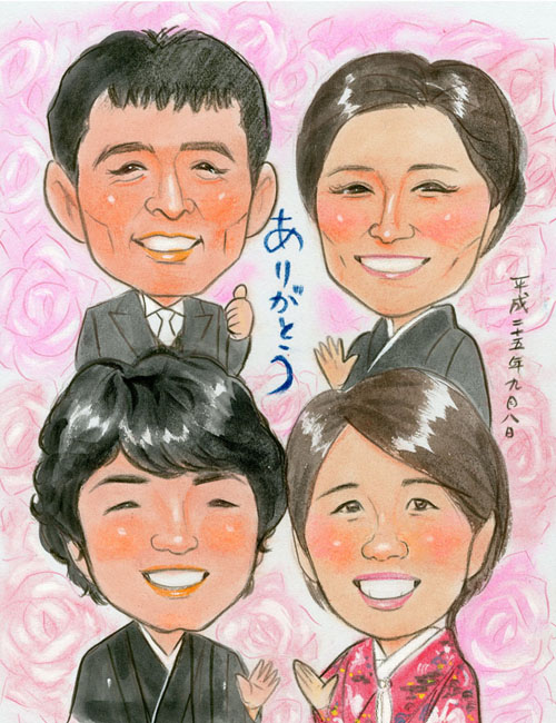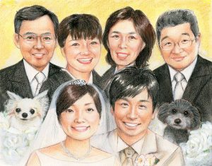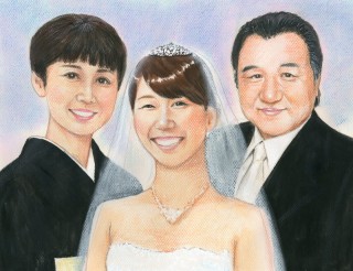 結婚記念にご両親と一緒の似顔絵プレゼント、リアルタッチ色鉛筆肖像画タイプ