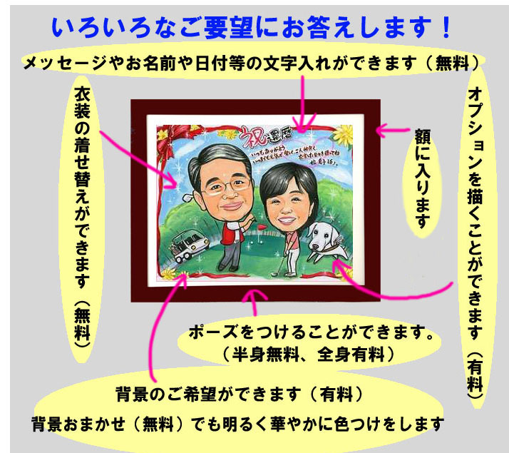 両親とペットの似顔絵プレゼント 思い出の風景やメッセージも入ります。