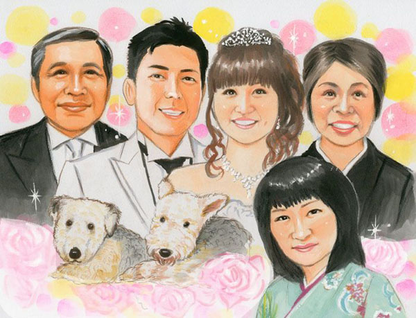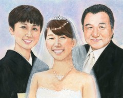 ご両家のご両親をご趣味のピアノや会社を背景にパステルタッチで描かせて頂きました。