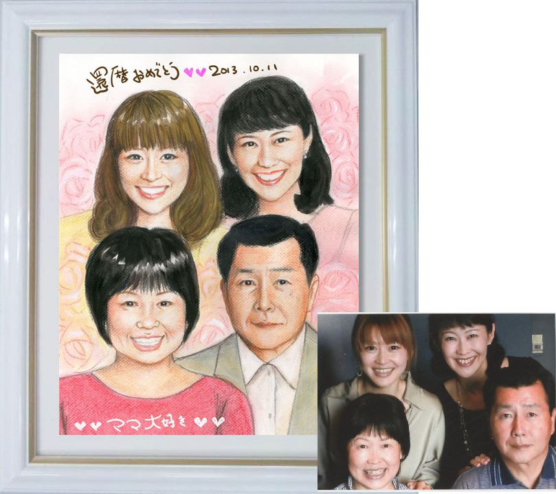実物の絵は、見せて頂いた画像よりもやはりもっともっと私たちに似ていて!!本当に感激しました☆★2013.10月 パステル色鉛筆肖像画タイプ、リアルタッチ ご家族の似顔絵、還暦のプレゼント