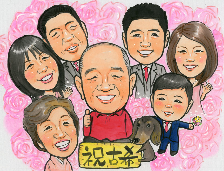 2013年11月 お父様の古希のお祝いにご家族の似顔絵プレゼント ペットとお孫さんも一緒