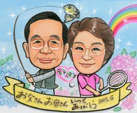 2013.7月 ご両親の還暦のお祝いに山登りの服装と山の背景を描かせていただきました。 鹿児島県のお客様より
