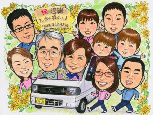 営業の思い出!愛車に乗った退職祝いの似顔絵プレゼント